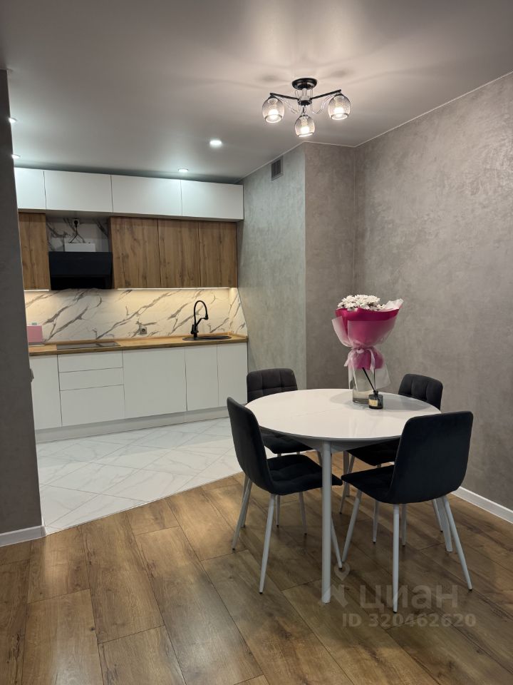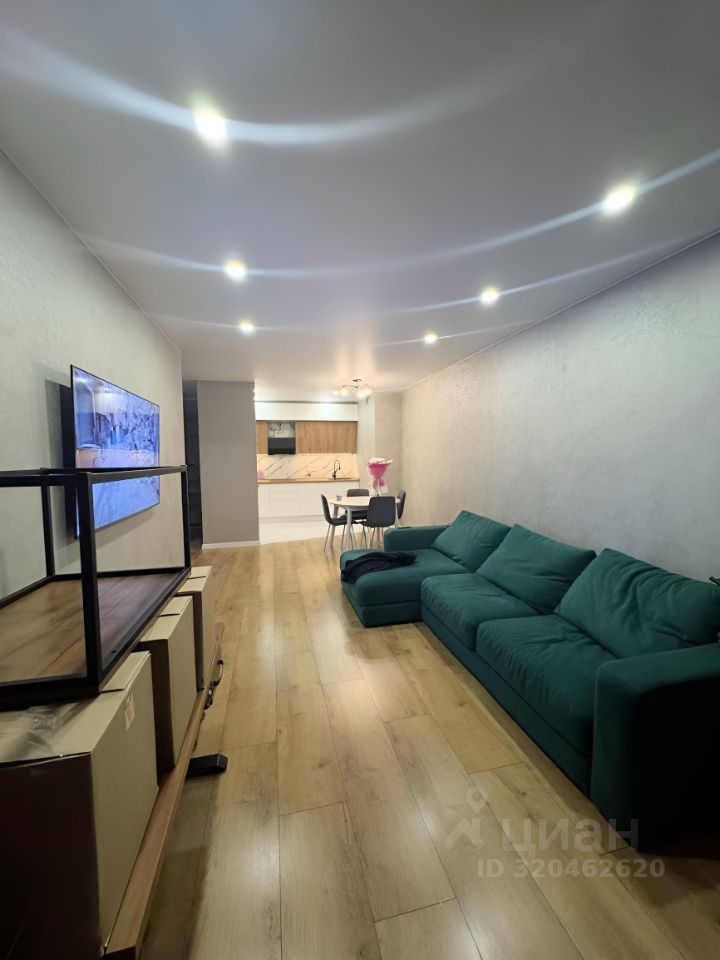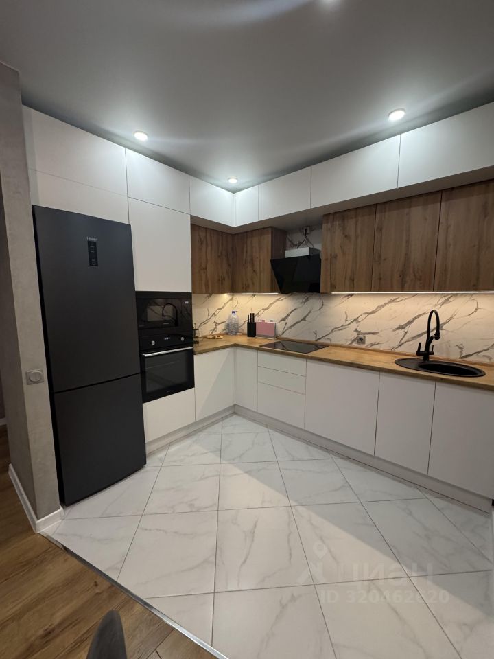 Просторная кухня-гостинная с встраиваемой техникой.