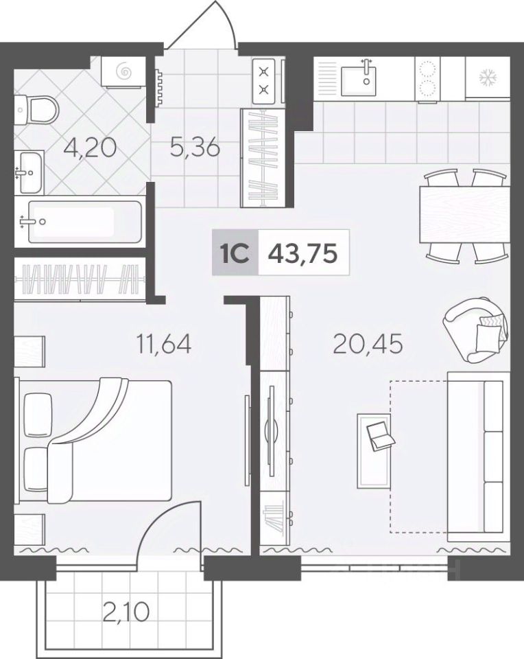 Однокомнатная квартира 43.75 кв.м на 2 этаже с планировкой, сочетающей комфорт и функциональность. Здесь легко создать атмосферу уюта и спокойствия, а кухня-гостиная позволит проводить много времени за совместными занятиями или принимать гостей.