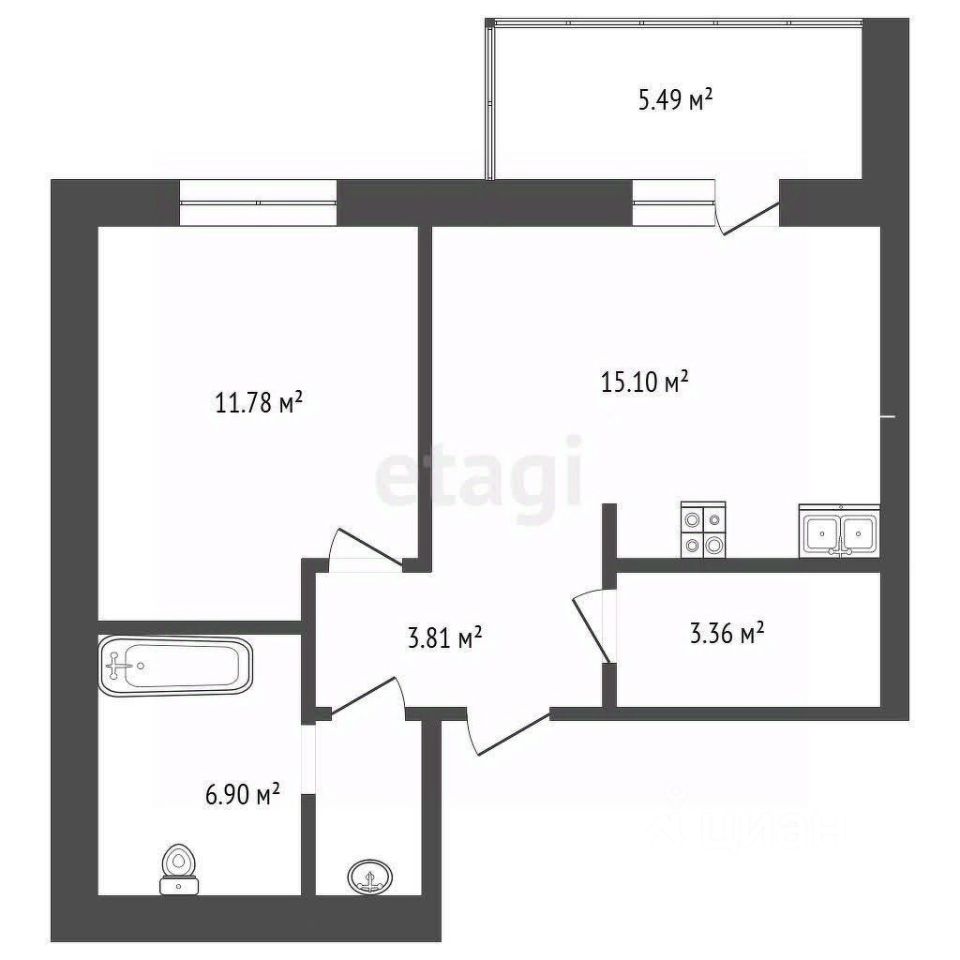 Квартира 42 кв.м. Кухня-гостиная 15кв.м. с выходом на лоджию, удобно разделена на 2 зоны кухни и зону отдыха.