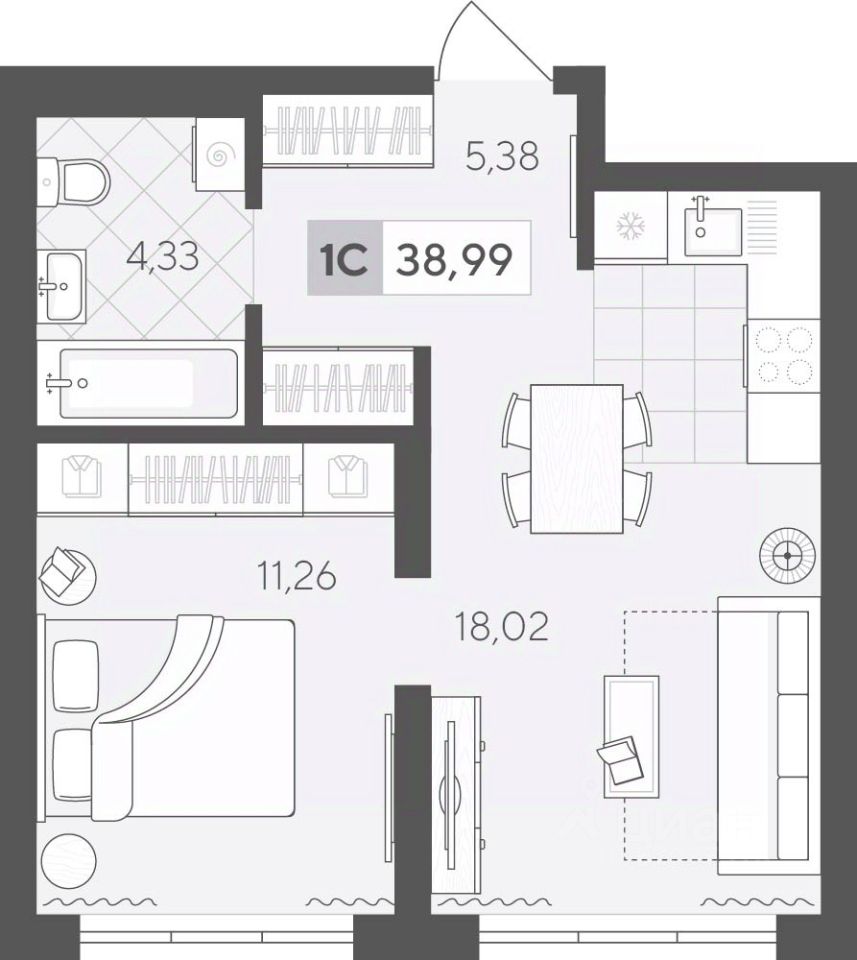 Продаётся 1-комнатная квартира в строящемся доме (ГП 2 (Сергея Корепанова, 34)), срок сдачи: IV-кв. 2027, общей площадью 38.99 кв.м., на 8 этаже. Новый жилой комплекс ''Скандиа. Квартал у Леса'' от Специализированного застройщика ''СКАНДИА У ЛЕСА'' расположен в г. Тюмень на ул. Бориса Прудаева.