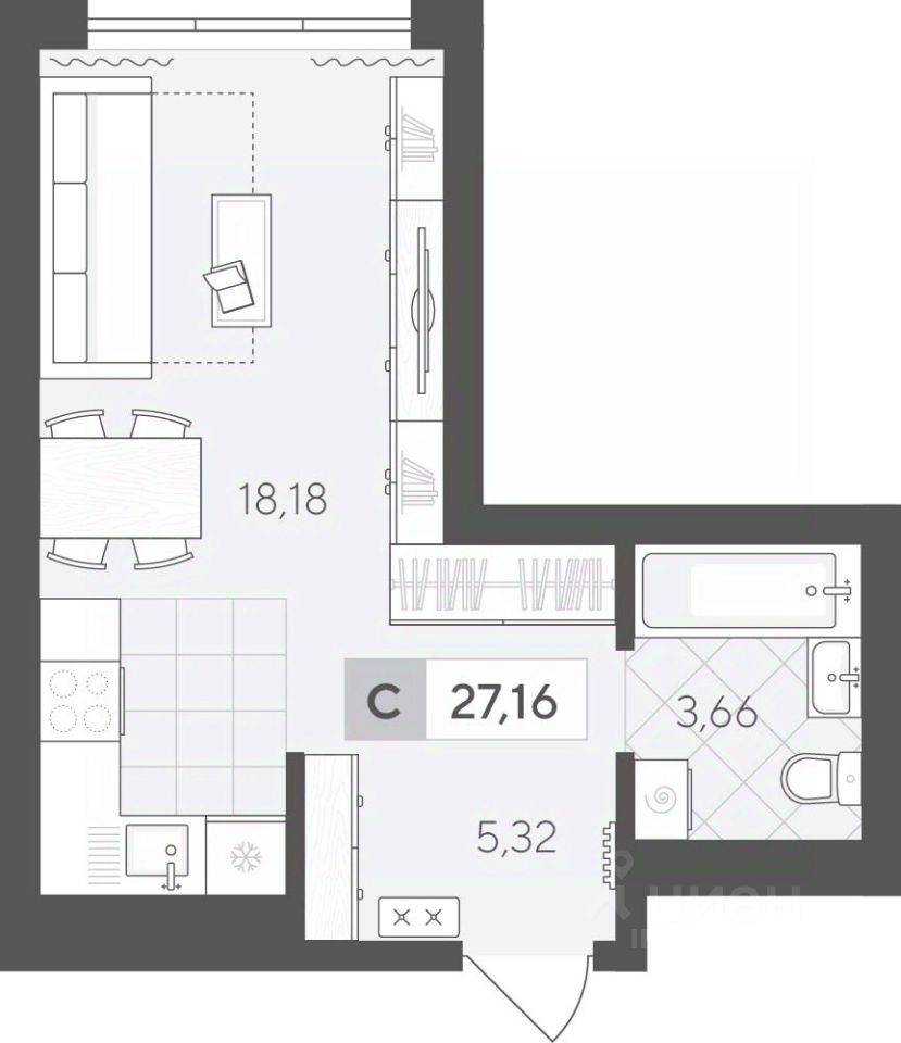 Продаётся студия в строящемся доме (ГП 2 (Сергея Корепанова, 34)), срок сдачи: IV-кв. 2027, общей площадью 27.16 кв.м., на 17 этаже. Новый жилой комплекс ''Скандиа. Квартал у Леса'' от Специализированного застройщика ''СКАНДИА У ЛЕСА'' расположен в г. Тюмень на ул. Бориса Прудаева.
