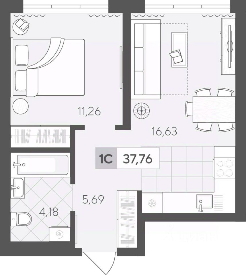 Продаётся 1-комнатная квартира в строящемся доме (ГП 2 (Сергея Корепанова, 34)), срок сдачи: IV-кв. 2027, общей площадью 37.76 кв.м., на 16 этаже. Новый жилой комплекс ''Скандиа. Квартал у Леса'' от Специализированного застройщика ''СКАНДИА У ЛЕСА'' расположен в г. Тюмень на ул. Бориса Прудаева.