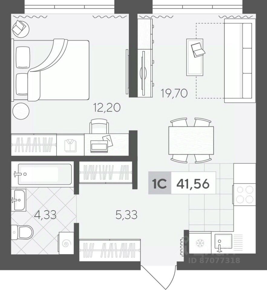 Продаётся 1-комнатная квартира в строящемся доме (ГП 2 (Сергея Корепанова, 34)), срок сдачи: IV-кв. 2027, общей площадью 41.56 кв.м., на 6 этаже. Новый жилой комплекс ''Скандиа. Квартал у Леса'' от Специализированного застройщика ''СКАНДИА У ЛЕСА'' расположен в г. Тюмень на ул. Бориса Прудаева.