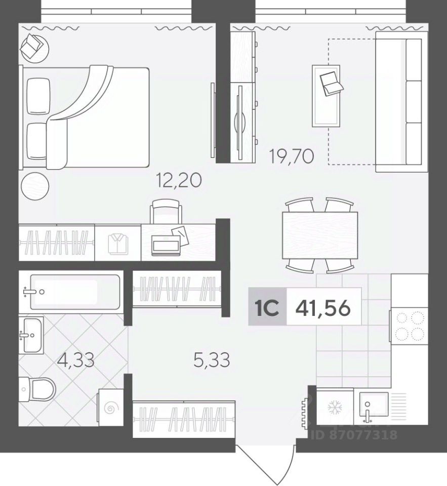 Продаётся 1-комнатная квартира в строящемся доме (ГП 2 (Сергея Корепанова, 34)), срок сдачи: IV-кв. 2027, общей площадью 41.56 кв.м., на 8 этаже. Новый жилой комплекс ''Скандиа. Квартал у Леса'' от Специализированного застройщика ''СКАНДИА У ЛЕСА'' расположен в г. Тюмень на ул. Бориса Прудаева.
