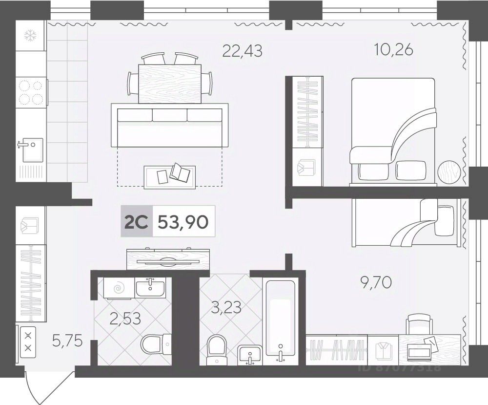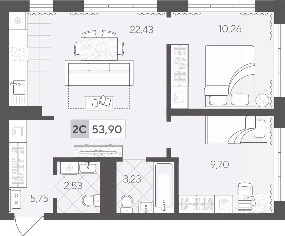 Продаётся 2-комнатная квартира в строящемся доме (ГП 2 (Сергея Корепанова, 34)), срок сдачи: IV-кв. 2027, общей площадью 53.9 кв.м., на 12 этаже. Новый жилой комплекс ''Скандиа. Квартал у Леса'' от Специализированного застройщика ''СКАНДИА У ЛЕСА'' расположен в г. Тюмень на ул. Бориса Прудаева.