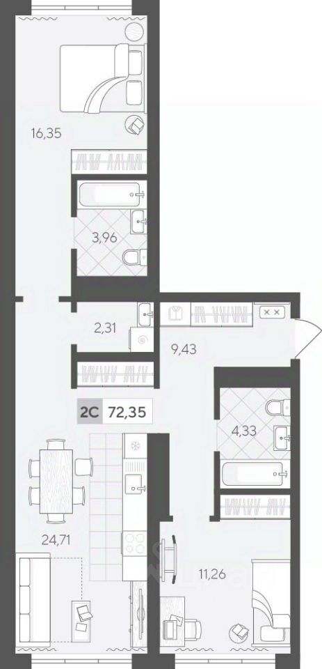 Продаётся 2-комнатная квартира в строящемся доме (ГП 2 (Сергея Корепанова, 34)), срок сдачи: IV-кв. 2027, общей площадью 72.35 кв.м., на 10 этаже. Новый жилой комплекс ''Скандиа. Квартал у Леса'' от Специализированного застройщика ''СКАНДИА У ЛЕСА'' расположен в г. Тюмень на ул. Бориса Прудаева.