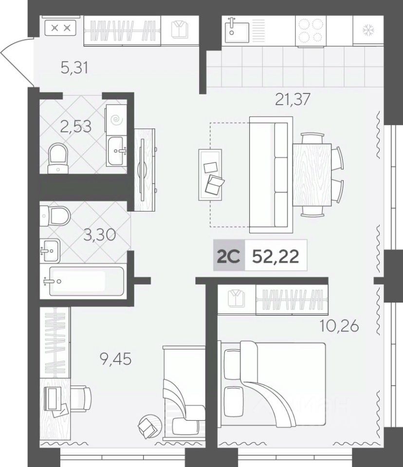 Продаётся 2-комнатная квартира в строящемся доме (ГП 2 (Сергея Корепанова, 34)), срок сдачи: IV-кв. 2027, общей площадью 52.22 кв.м., на 13 этаже. Новый жилой комплекс ''Скандиа. Квартал у Леса'' от Специализированного застройщика ''СКАНДИА У ЛЕСА'' расположен в г. Тюмень на ул. Бориса Прудаева.