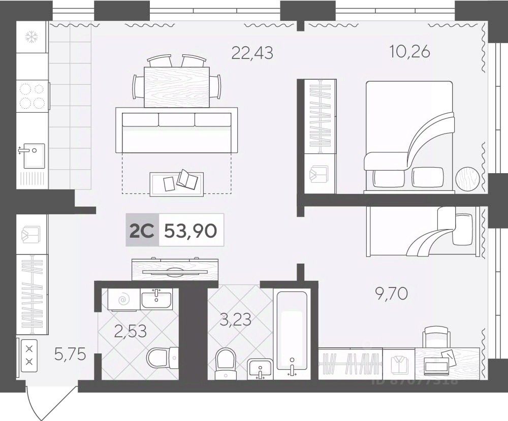 Продаётся 2-комнатная квартира в строящемся доме (ГП 2 (Сергея Корепанова, 34)), срок сдачи: IV-кв. 2027, общей площадью 53.9 кв.м., на 14 этаже. Новый жилой комплекс ''Скандиа. Квартал у Леса'' от Специализированного застройщика ''СКАНДИА У ЛЕСА'' расположен в г. Тюмень на ул. Бориса Прудаева.