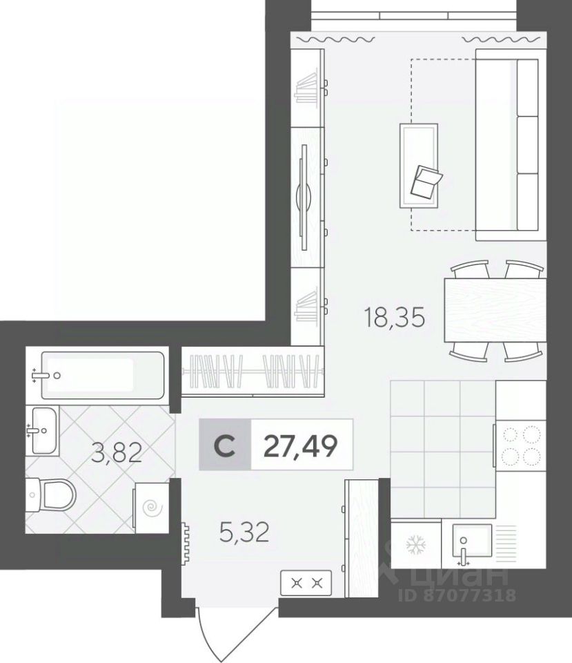 Продаётся студия в строящемся доме (ГП 2 (Сергея Корепанова, 34)), срок сдачи: IV-кв. 2027, общей площадью 27.49 кв.м., на 2 этаже. Новый жилой комплекс ''Скандиа. Квартал у Леса'' от Специализированного застройщика ''СКАНДИА У ЛЕСА'' расположен в г. Тюмень на ул. Бориса Прудаева.