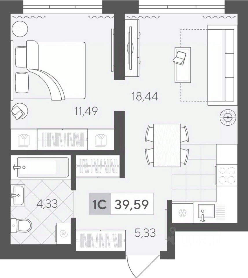 Продаётся 1-комнатная квартира в строящемся доме (ГП 2 (Сергея Корепанова, 34)), срок сдачи: IV-кв. 2027, общей площадью 39.59 кв.м., на 5 этаже. Новый жилой комплекс ''Скандиа. Квартал у Леса'' от Специализированного застройщика ''СКАНДИА У ЛЕСА'' расположен в г. Тюмень на ул. Бориса Прудаева.