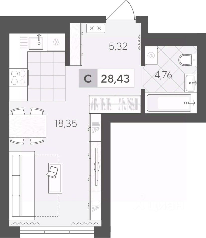 Продаётся студия в строящемся доме (ГП 2 (Сергея Корепанова, 34)), срок сдачи: IV-кв. 2027, общей площадью 28.43 кв.м., на 5 этаже. Новый жилой комплекс ''Скандиа. Квартал у Леса'' от Специализированного застройщика ''СКАНДИА У ЛЕСА'' расположен в г. Тюмень на ул. Бориса Прудаева.