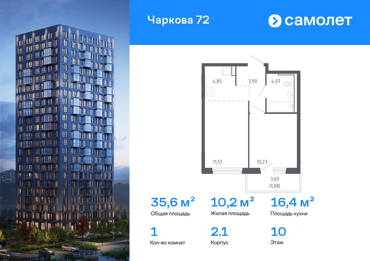 Строим кварталы для жизни с заботой о будущем. Предлагается 1-комнатная квартира комфорт-класса 35,64 кв.м в корпусе 2.1 на 10 этаже, в ЖК ''Чаркова 72'' Квартира с чистовой отделкой. Доступность дополнительных опций уточняйте у застройщика.