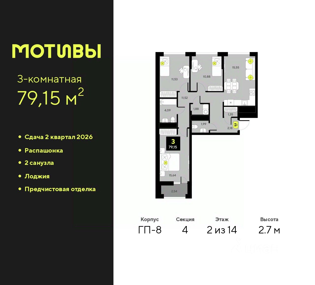 3-комн. квартира с предчистовой отделкой в ЖК ''Мотивы'' на 2 этаже. Общая площадь: 79.15 кв.м., жилая: 38.05 кв.м., площадь просторной кухни-столовой: 15.55 кв.м. Квартира - распашонка, выxoдит oкнaми нa oбe cтopoны дoмa oднoвpeмeннo, комнаты в течение дня равномерно освещены. В квартире одна лоджия, один совмещенный и один раздельный санузел. Высота потолков 2.7 м.