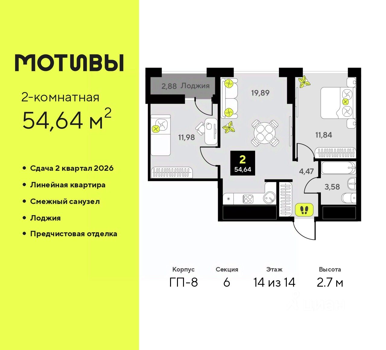 2-комн. квартира с предчистовой отделкой в ЖК ''Мотивы'' на 14 этаже. Общая площадь: 54.64 кв.м., жилая: 23.82 кв.м., площадь просторной кухни-столовой: 19.89 кв.м. Комнаты изолированные, все окна выходят на одну сторону. В квартире одна лоджия, один совмещенный санузел. Высота потолков 2.7 м.