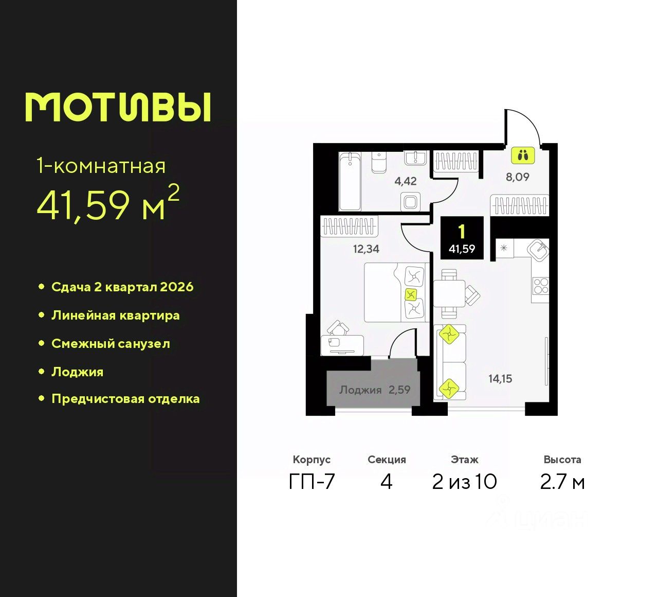 Однокомнатная квартира с предчистовой отделкой в ЖК ''Мотивы'' на 2 этаже. Общая площадь: 41.59 кв.м., жилая: 12.34 кв.м., площадь просторной кухни-столовой: 14.15 кв.м. Все окна выходят на одну сторону. В квартире одна лоджия, один совмещенный санузел. Высота потолков 2.7 м.