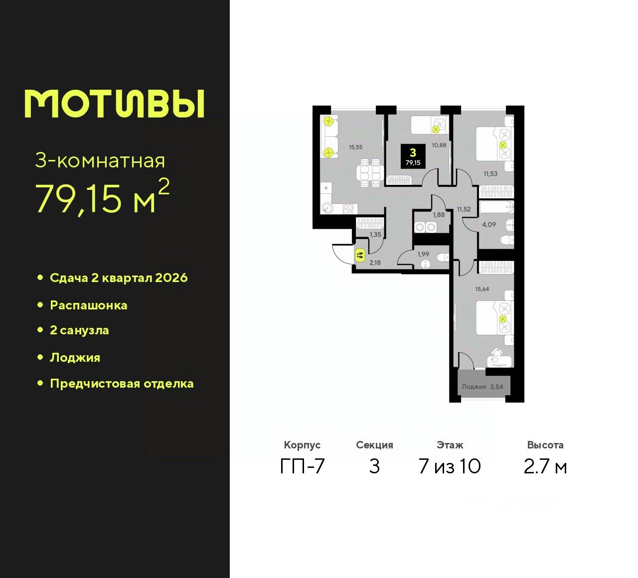 3-комн. квартира от застройщика с предчистовой отделкой в ЖК ''Мотивы'' на 7 этаже. Общая площадь: 79.15 кв.м., жилая: 38.05 кв.м., площадь просторной кухни-столовой: 15.55 кв.м. Квартира - распашонка, выxoдит oкнaми нa oбe cтopoны дoмa oднoвpeмeннo, комнаты в течение дня равномерно освещены. В квартире одна лоджия, один совмещенный и один раздельный санузел. Высота потолков 2.7 м.