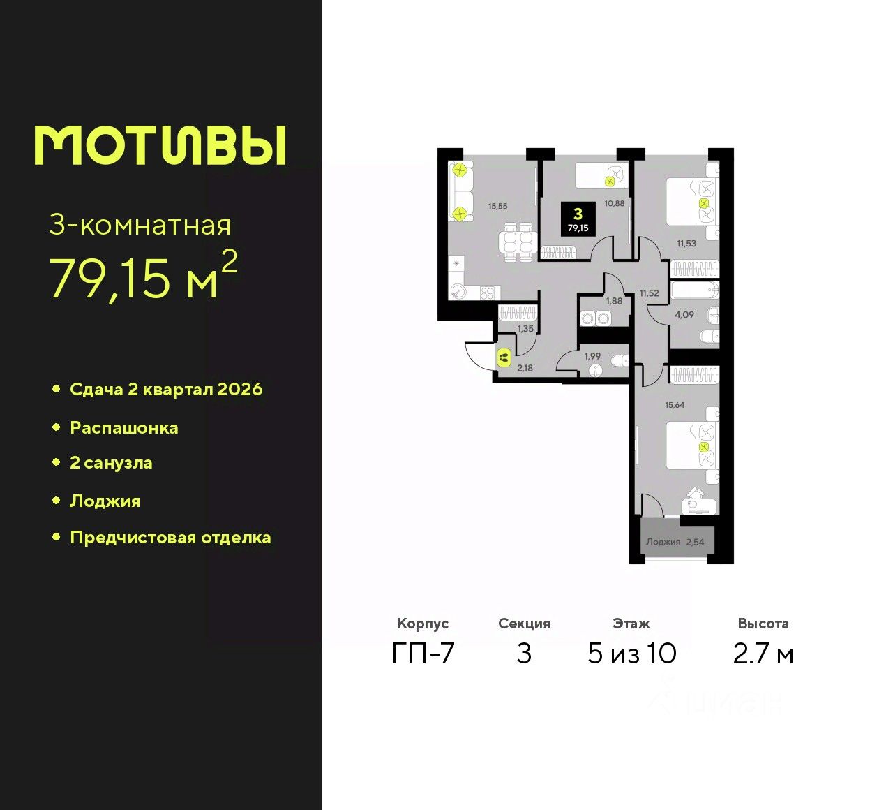 Продается 3-комн. квартира с предчистовой отделкой в ЖК ''Мотивы'' на 5 этаже. Общая площадь: 79.15 кв.м., жилая: 38.05 кв.м., площадь просторной кухни-столовой: 15.55 кв.м. Квартира - распашонка, без проходных комнат, окна выходят на paзные стороны дома. В квартире одна лоджия, один совмещенный и один раздельный санузел. Высота потолков 2.7 м.