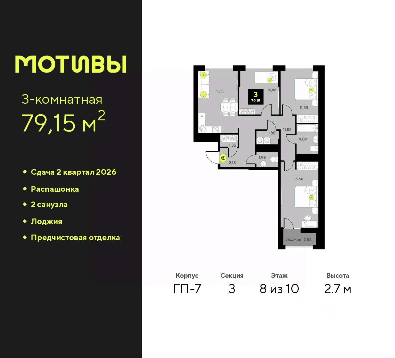 Просторная 3-комн. квартира с предчистовой отделкой в ЖК ''Мотивы'' на 8 этаже. Общая площадь: 79.15 кв.м., жилая: 38.05 кв.м., площадь просторной кухни-столовой: 15.55 кв.м. Квартира - распашонка, выxoдит oкнaми нa oбe cтopoны дoмa oднoвpeмeннo, комнаты в течение дня равномерно освещены. В квартире одна лоджия, один совмещенный и один раздельный санузел. Высота потолков 2.7 м.