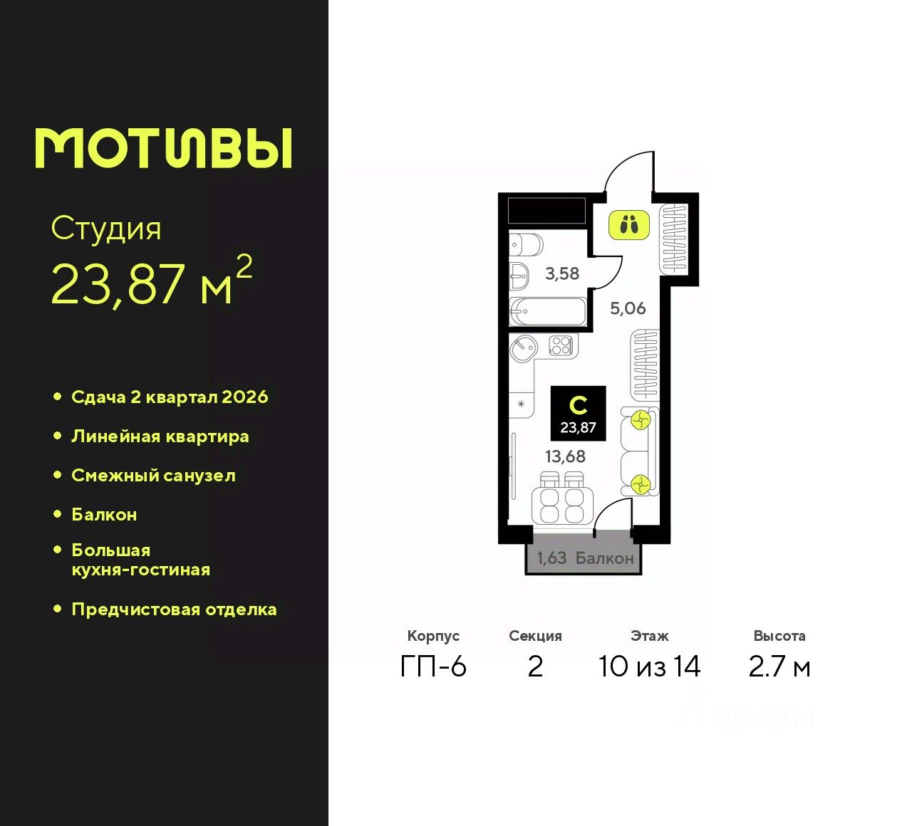 1-комн. квартира-студия с предчистовой отделкой в ЖК ''Мотивы'' на 10 этаже. Общая площадь: 23.87 кв.м., площадь гостиной 13.68 кв.м., из которых 5 кв.м. выделено под кухонную зону. Все окна выходят на одну сторону. В квартире один балкон, один совмещенный санузел. Высота потолков 2.7 м.