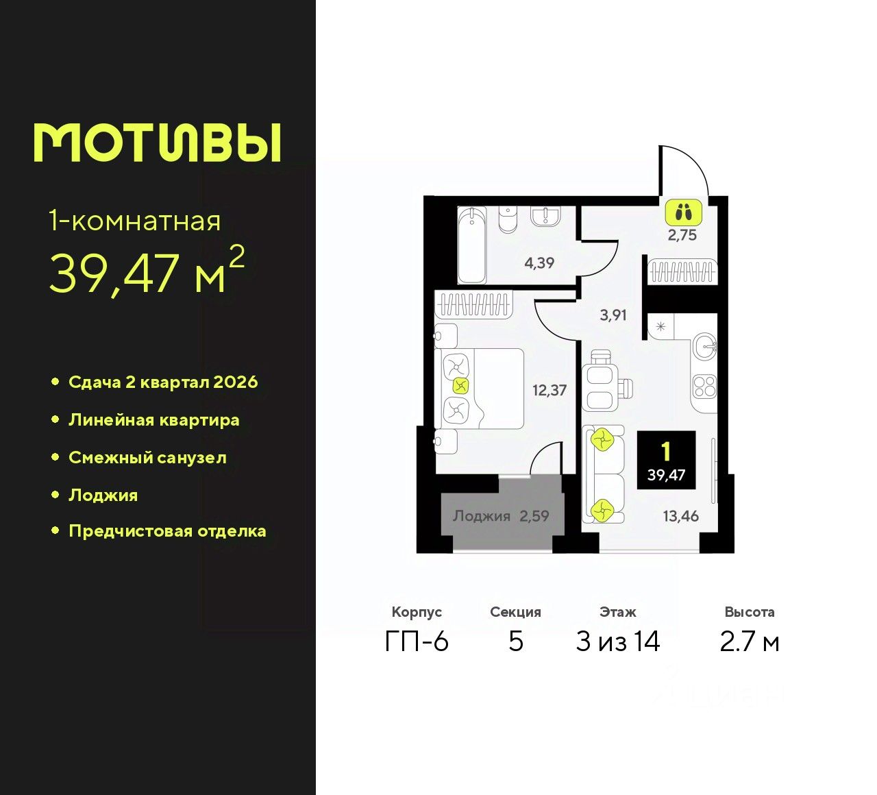 Просторная однокомнатная квартира с предчистовой отделкой в ЖК ''Мотивы'' на 3 этаже. Общая площадь: 39.47 кв.м., жилая: 12.37 кв.м., площадь просторной кухни-столовой: 13.53 кв.м. Все окна выходят на одну сторону. В квартире одна лоджия, один совмещенный санузел. Высота потолков 2.7 м.