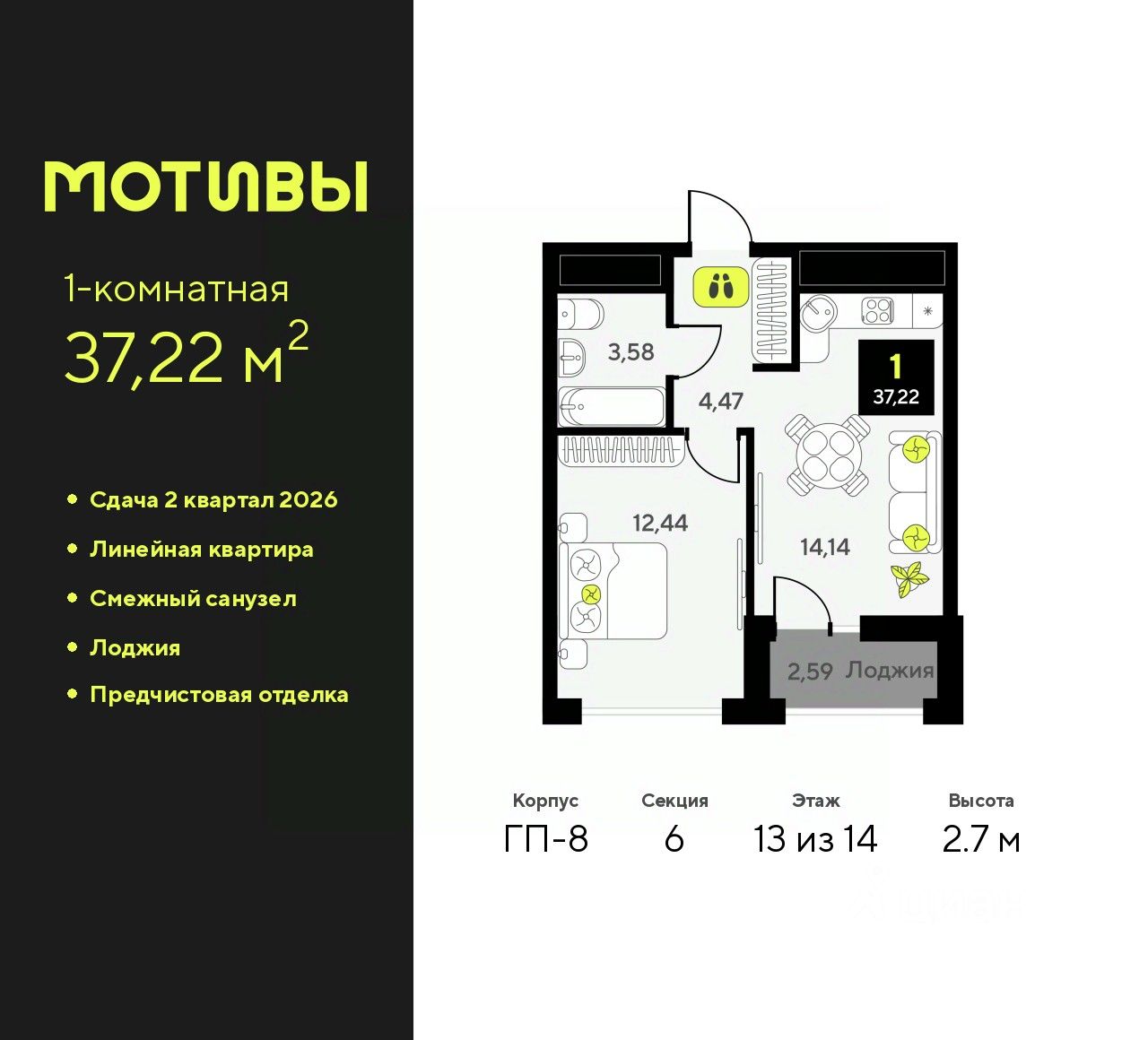 1-комн. квартира от застройщика с предчистовой отделкой в ЖК ''Мотивы'' на 13 этаже. Общая площадь: 37.22 кв.м., жилая: 12.44 кв.м., площадь просторной кухни-столовой: 14.14 кв.м. Все окна выходят на одну сторону. В квартире одна лоджия, один совмещенный санузел. Высота потолков 2.7 м.