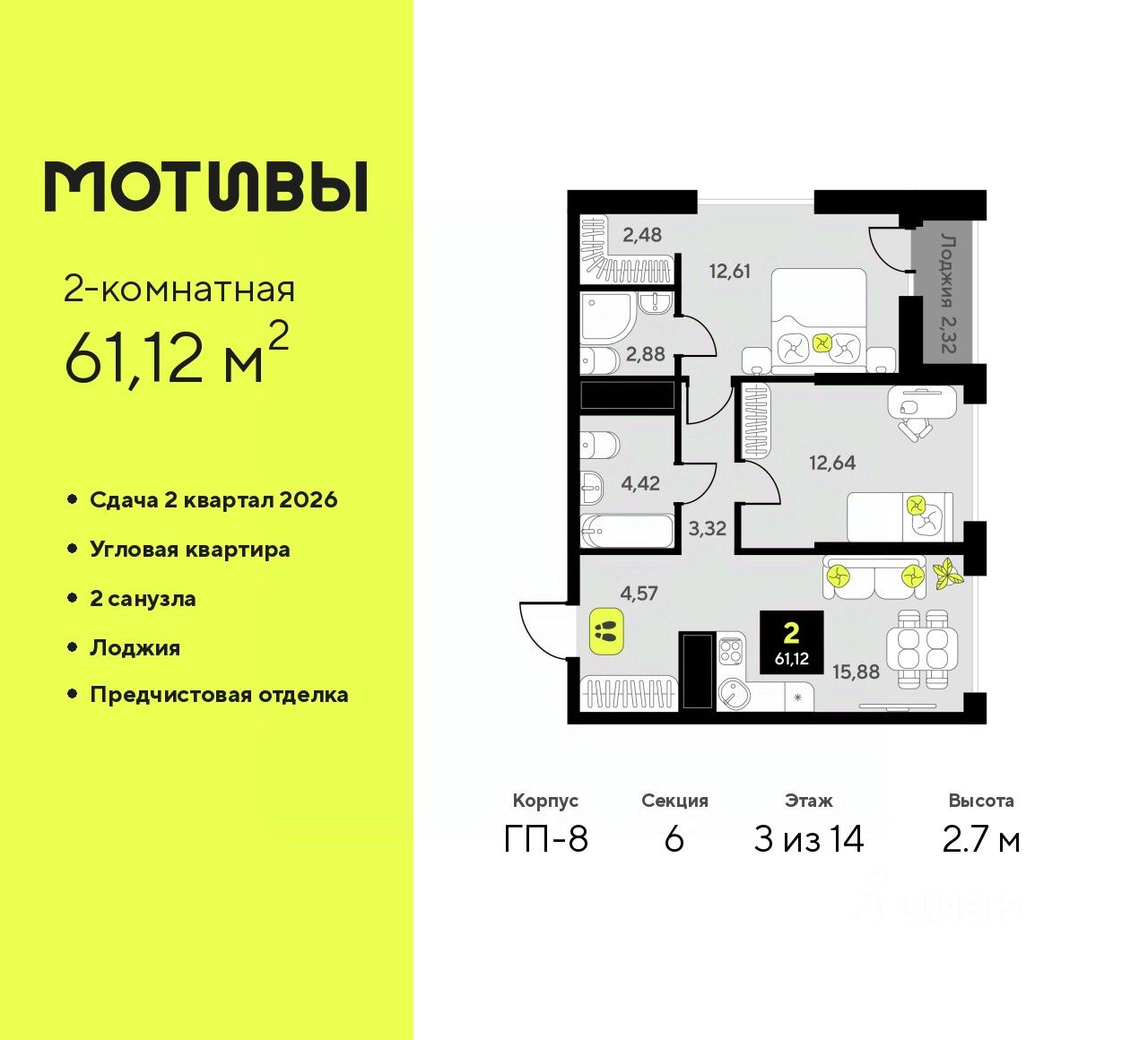 Двухкомнатная квартира от застройщика с предчистовой отделкой в ЖК ''Мотивы'' на 3 этаже. Общая площадь: 61.12 кв.м., жилая: 25.25 кв.м., площадь просторной кухни-столовой: 15.88 кв.м. Квартира угловая, идеально подойдет любителям тишины и панорамных видов. В квартире одна лоджия, два совмещенных санузла. Высота потолков 2.7 м.
