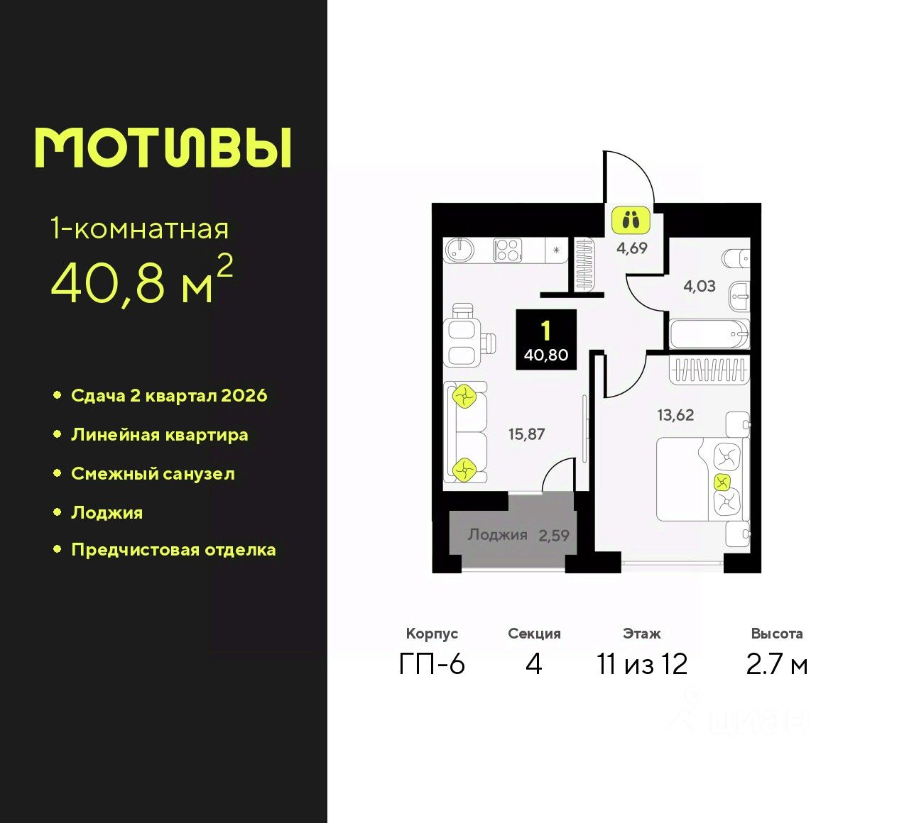 1-комн. квартира с предчистовой отделкой в ЖК ''Мотивы'' на 11 этаже. Общая площадь: 40.8 кв.м., жилая: 13.62 кв.м., площадь просторной кухни-столовой: 15.87 кв.м. Все окна выходят на одну сторону. В квартире одна лоджия, один совмещенный санузел. Высота потолков 2.7 м.