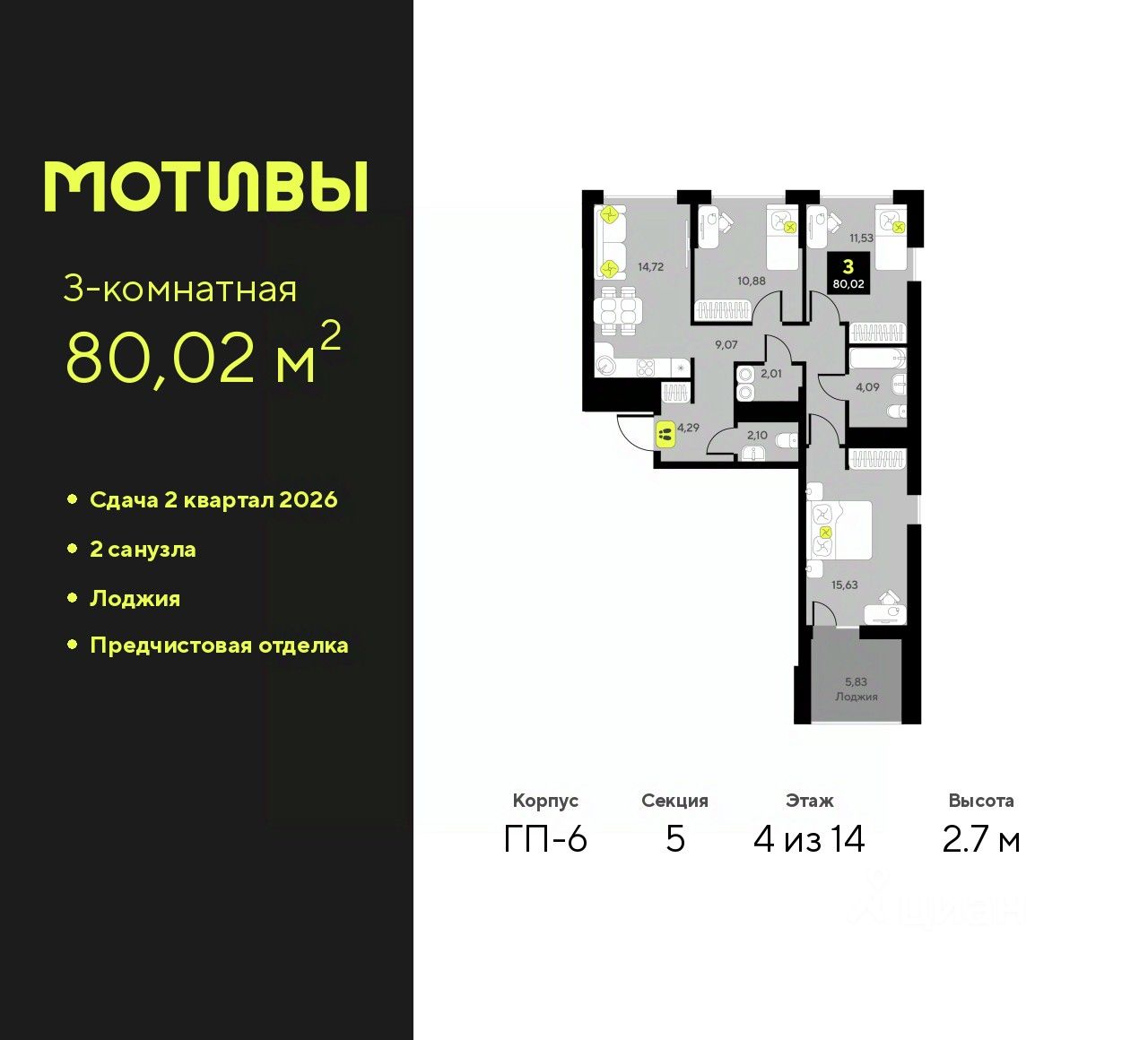 Трехкомнатная квартира с предчистовой отделкой в ЖК ''Мотивы'' на 4 этаже. Общая площадь: 80.02 кв.м., жилая: 37.95 кв.м., площадь просторной кухни-столовой: 14.72 кв.м. Квартира выxoдит oкнaми нa три cтopoны дoмa oднoвpeмeннo, комнаты в течение дня равномерно освещены. В квартире одна лоджия, один совмещенный и один раздельный санузел. Высота потолков 2.7 м.