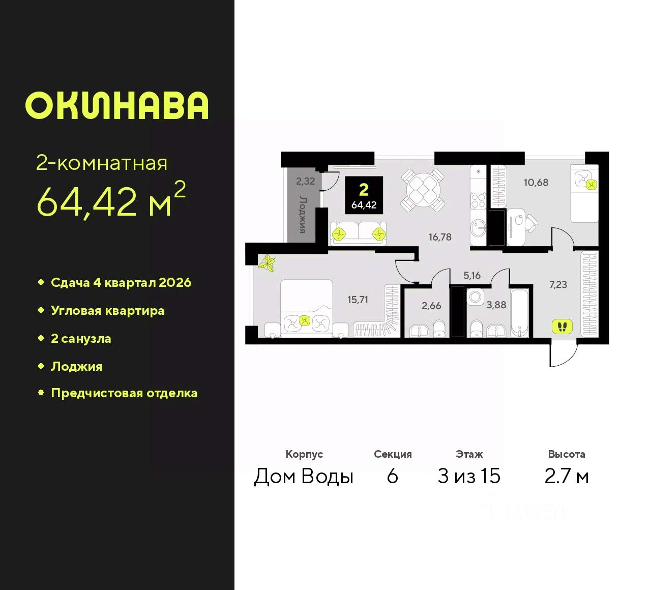 Продается двухкомнатная квартира с предчистовой отделкой в ЖК ''Окинава'' на 3 этаже. Общая площадь: 64.42 кв.м., жилая: 26.39 кв.м., площадь просторной кухни-столовой: 16.78 кв.м. Угловая квартира, идеально подойдет любителям тишины и панорамных видов. В квартире одна лоджия, один совмещенный и один раздельный санузел. Высота потолков 2.7 м.