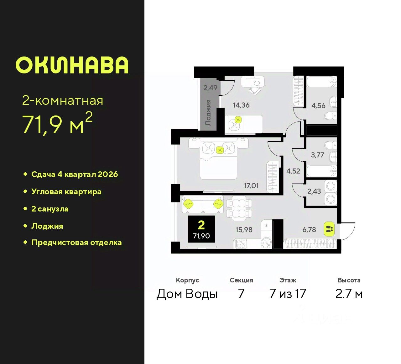 Просторная двухкомнатная квартира с предчистовой отделкой в ЖК ''Окинава'' на 7 этаже. Общая площадь: 71.9 кв.м., жилая: 31.37 кв.м., площадь просторной кухни-столовой: 15.98 кв.м. Квартира угловая, идеально подойдет любителям тишины и панорамных видов. В квартире одна лоджия, два совмещенных санузла. Высота потолков 2.7 м.