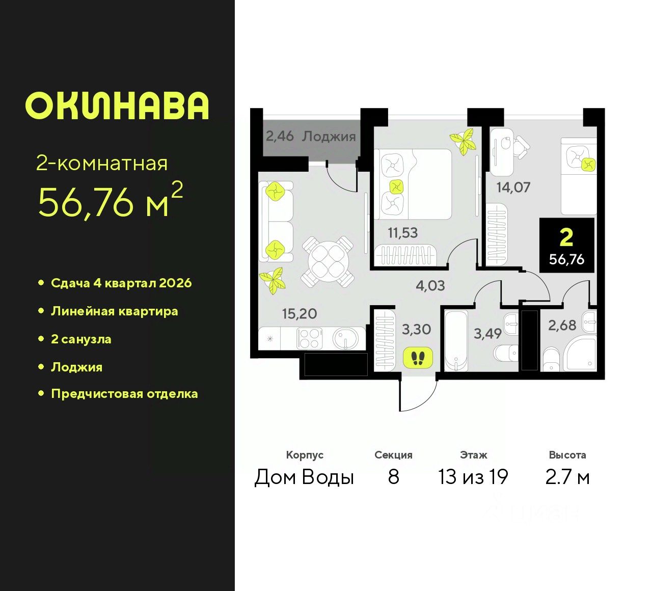 Просторная двухкомнатная квартира с предчистовой отделкой в ЖК ''Окинава'' на 13 этаже. Общая площадь: 56.76 кв.м., жилая: 25.6 кв.м., площадь просторной кухни-столовой: 15.2 кв.м. Комнаты изолированные, все окна выходят на одну сторону. В квартире одна лоджия, два совмещенных санузла. Высота потолков 2.7 м.