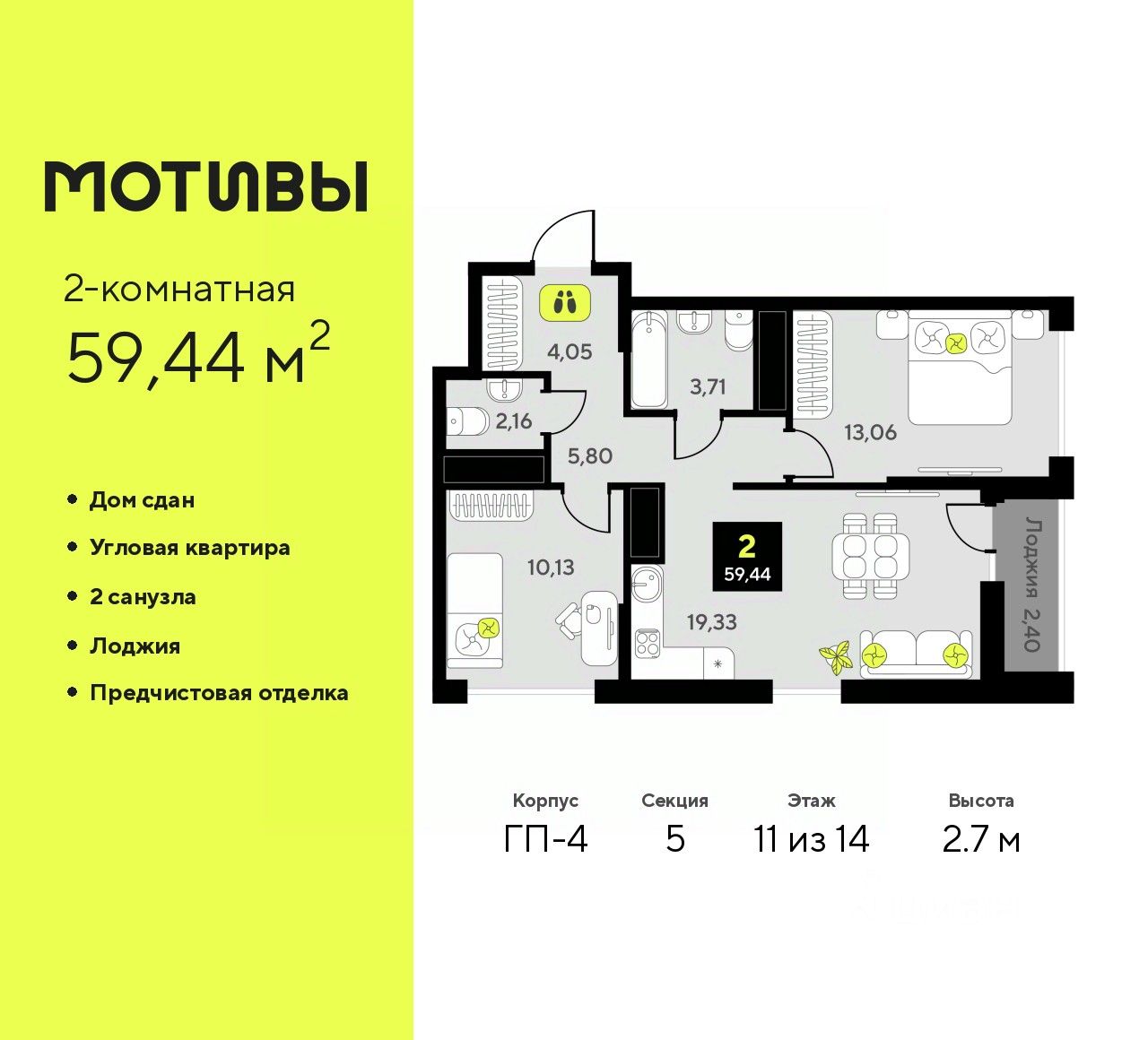 2-комн. квартира с предчистовой отделкой в ЖК ''Мотивы'' на 11 этаже. Общая площадь: 59.44 кв.м., жилая: 23.19 кв.м., площадь просторной кухни-столовой: 19.33 кв.м. Квартира угловая, идеально подойдет любителям тишины и панорамных видов. В квартире одна лоджия, один совмещенный и один раздельный санузел. Высота потолков 2.7 м.