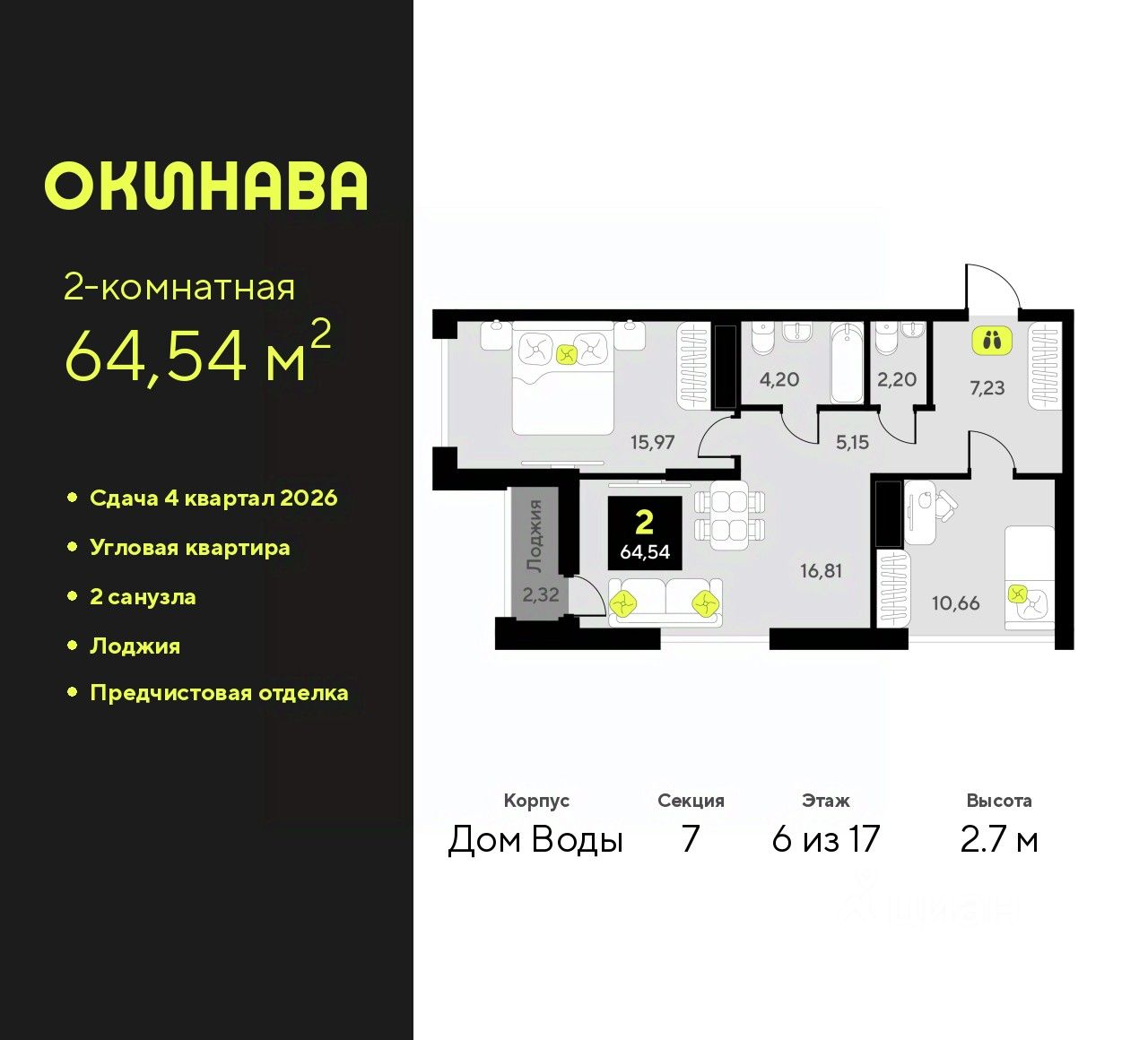 Двухкомнатная квартира от застройщика с предчистовой отделкой в ЖК ''Окинава'' на 6 этаже. Общая площадь: 64.54 кв.м., жилая: 26.63 кв.м., площадь просторной кухни-столовой: 16.81 кв.м. Угловая квартира, очень светлая, естественная вентиляция при открытии окон. В квартире одна лоджия, один совмещенный и один раздельный санузел. Высота потолков 2.7 м.