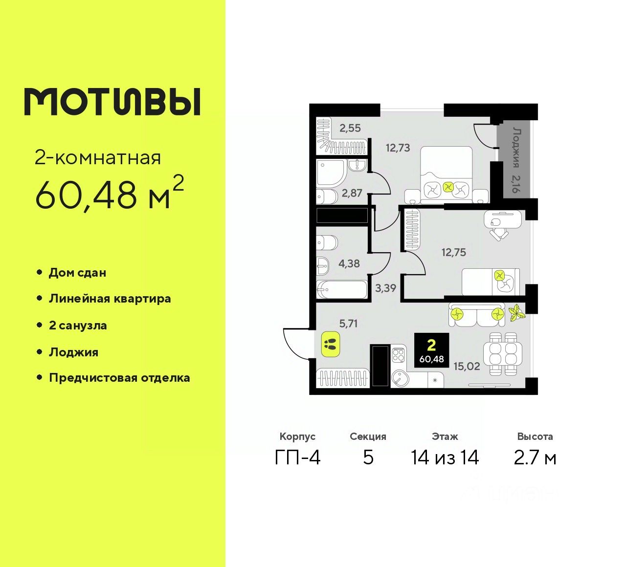 Просторная двухкомнатная квартира с предчистовой отделкой в ЖК ''Мотивы'' на 14 этаже. Общая площадь: 60.48 кв.м., жилая: 25.48 кв.м., площадь просторной кухни-столовой: 15.02 кв.м. Комнаты изолированные, все окна выходят на одну сторону. В квартире одна лоджия, два совмещенных санузла. Высота потолков 2.7 м.