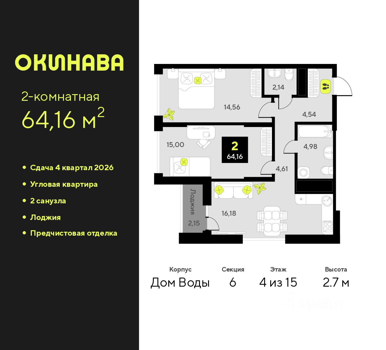 Продается 2-комн. квартира от застройщика с предчистовой отделкой в ЖК ''Окинава'' на 4 этаже. Общая площадь: 64.16 кв.м., жилая: 29.56 кв.м., площадь просторной кухни-столовой: 16.18 кв.м. Угловая квартира, очень светлая, естественная вентиляция при открытии окон. В квартире одна лоджия, один совмещенный и один раздельный санузел. Высота потолков 2.7 м.