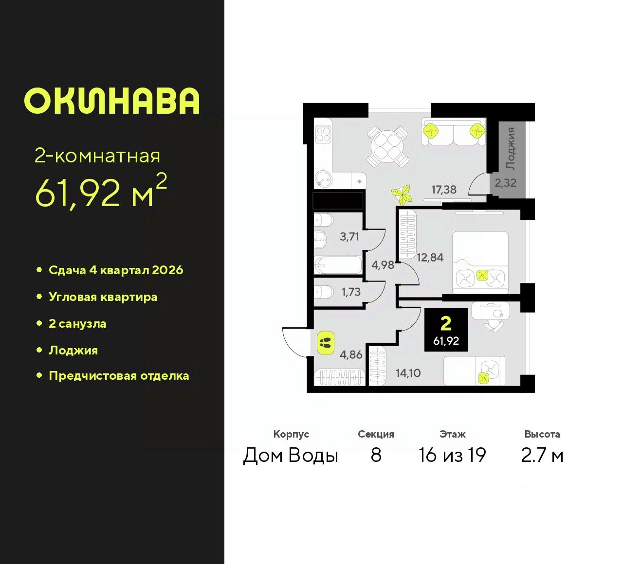 2-комн. квартира с предчистовой отделкой в ЖК ''Окинава'' на 16 этаже. Общая площадь: 61.92 кв.м., жилая: 26.94 кв.м., площадь просторной кухни-столовой: 17.38 кв.м. Квартира угловая, окна oбecпeчивaют paвнoмepнoe ocвeщeниe в тeчeниe дня. В квартире одна лоджия, один совмещенный и один раздельный санузел. Высота потолков 2.7 м.