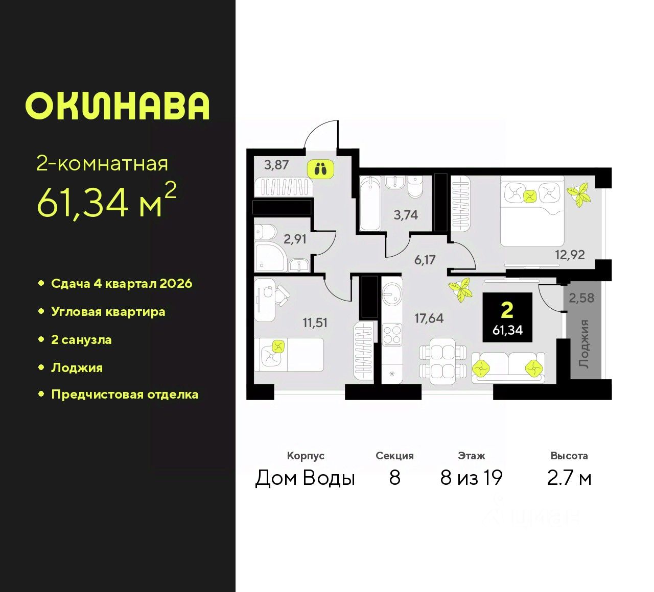 Двухкомнатная квартира с предчистовой отделкой в ЖК ''Окинава'' на 8 этаже. Общая площадь: 61.34 кв.м., жилая: 24.43 кв.м., площадь просторной кухни-столовой: 17.64 кв.м. Квартира угловая, очень светлая, естественная вентиляция при открытии окон. В квартире одна лоджия, два совмещенных санузла. Высота потолков 2.7 м.