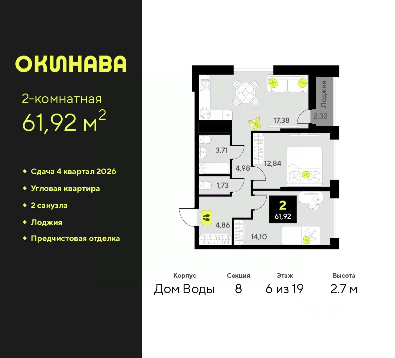 2-комн. квартира с предчистовой отделкой в ЖК ''Окинава'' на 6 этаже. Общая площадь: 61.92 кв.м., жилая: 26.94 кв.м., площадь просторной кухни-столовой: 17.38 кв.м. Квартира угловая, идеально подойдет любителям тишины и панорамных видов. В квартире одна лоджия, один совмещенный и один раздельный санузел. Высота потолков 2.7 м.