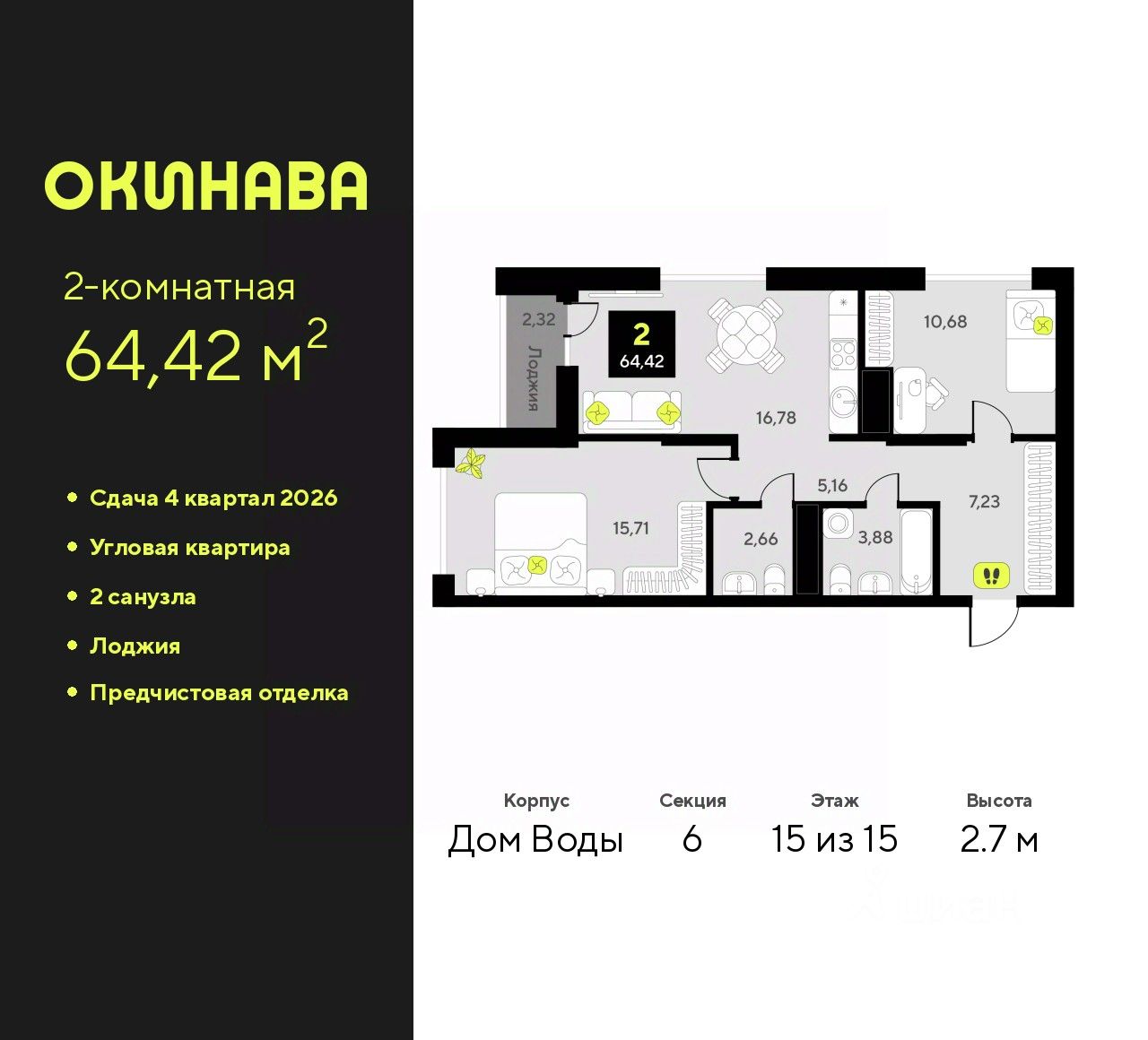 Продается 2-комн. квартира с предчистовой отделкой в ЖК ''Окинава'' на 15 этаже. Общая площадь: 64.42 кв.м., жилая: 26.39 кв.м., площадь просторной кухни-столовой: 16.78 кв.м. Квартира угловая, идеально подойдет любителям тишины и панорамных видов. В квартире одна лоджия, один совмещенный и один раздельный санузел. Высота потолков 2.7 м.