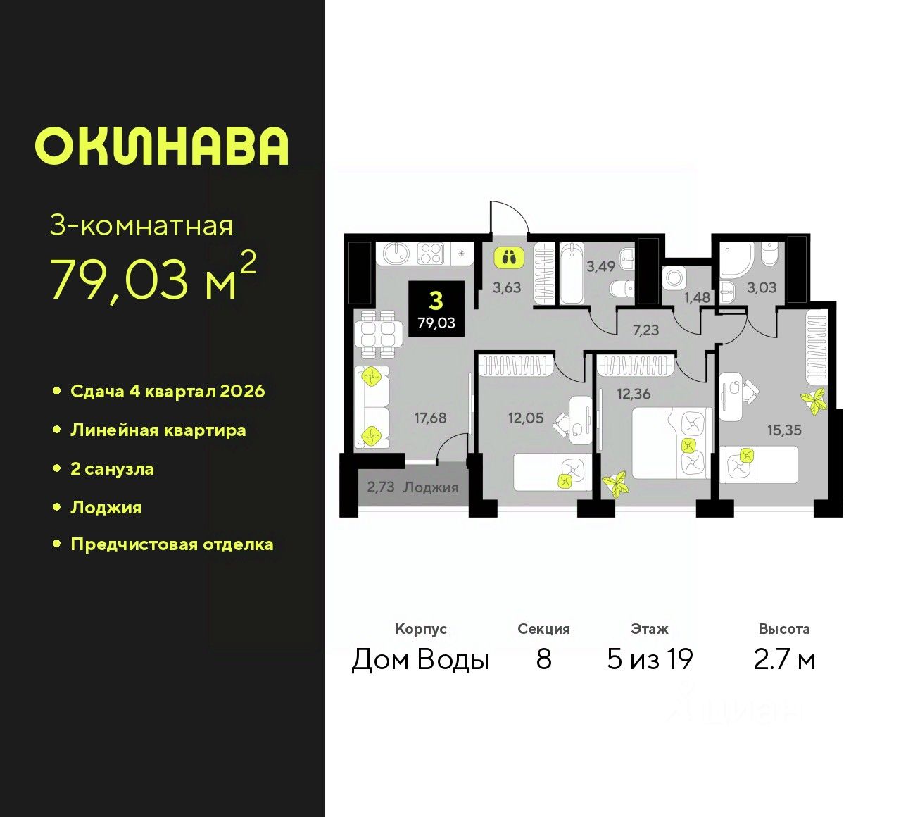 3-комн. квартира с предчистовой отделкой в ЖК ''Окинава'' на 5 этаже. Общая площадь: 79.03 кв.м., жилая: 39.76 кв.м., площадь просторной кухни-столовой: 17.68 кв.м. Комнаты изолированные, все окна выходят на одну сторону. В квартире одна лоджия, два совмещенных санузла. Высота потолков 2.7 м.