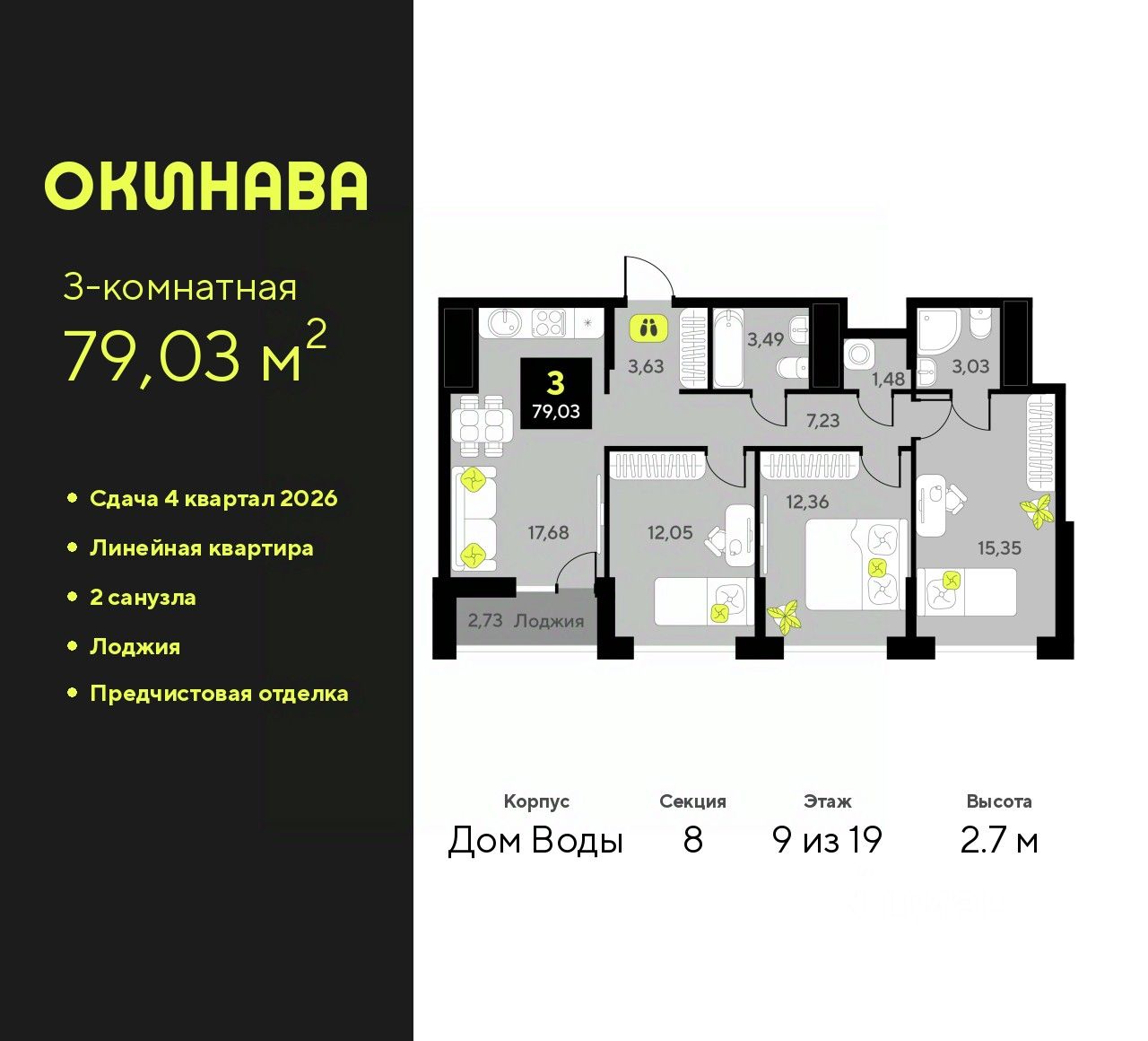Трехкомнатная квартира от застройщика с предчистовой отделкой в ЖК ''Окинава'' на 9 этаже. Общая площадь: 79.03 кв.м., жилая: 39.76 кв.м., площадь просторной кухни-столовой: 17.68 кв.м. Комнаты изолированные, все окна выходят на одну сторону. В квартире одна лоджия, два совмещенных санузла. Высота потолков 2.7 м.