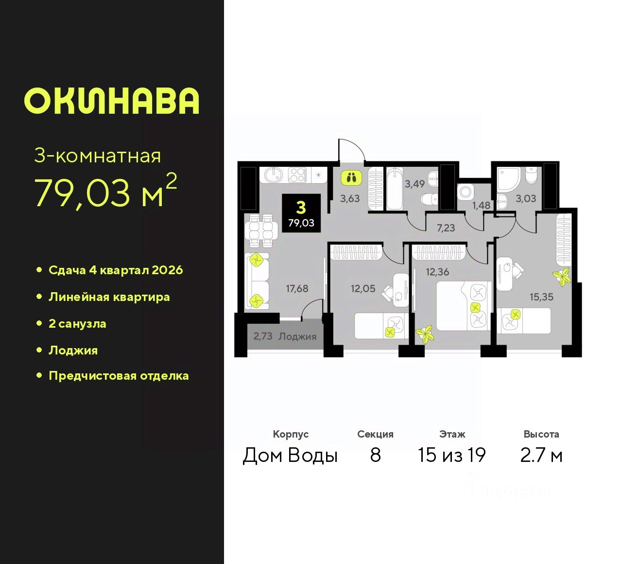 Трехкомнатная квартира от застройщика с предчистовой отделкой в ЖК ''Окинава'' на 15 этаже. Общая площадь: 79.03 кв.м., жилая: 39.76 кв.м., площадь просторной кухни-столовой: 17.68 кв.м. Комнаты изолированные, все окна выходят на одну сторону. В квартире одна лоджия, два совмещенных санузла. Высота потолков 2.7 м.