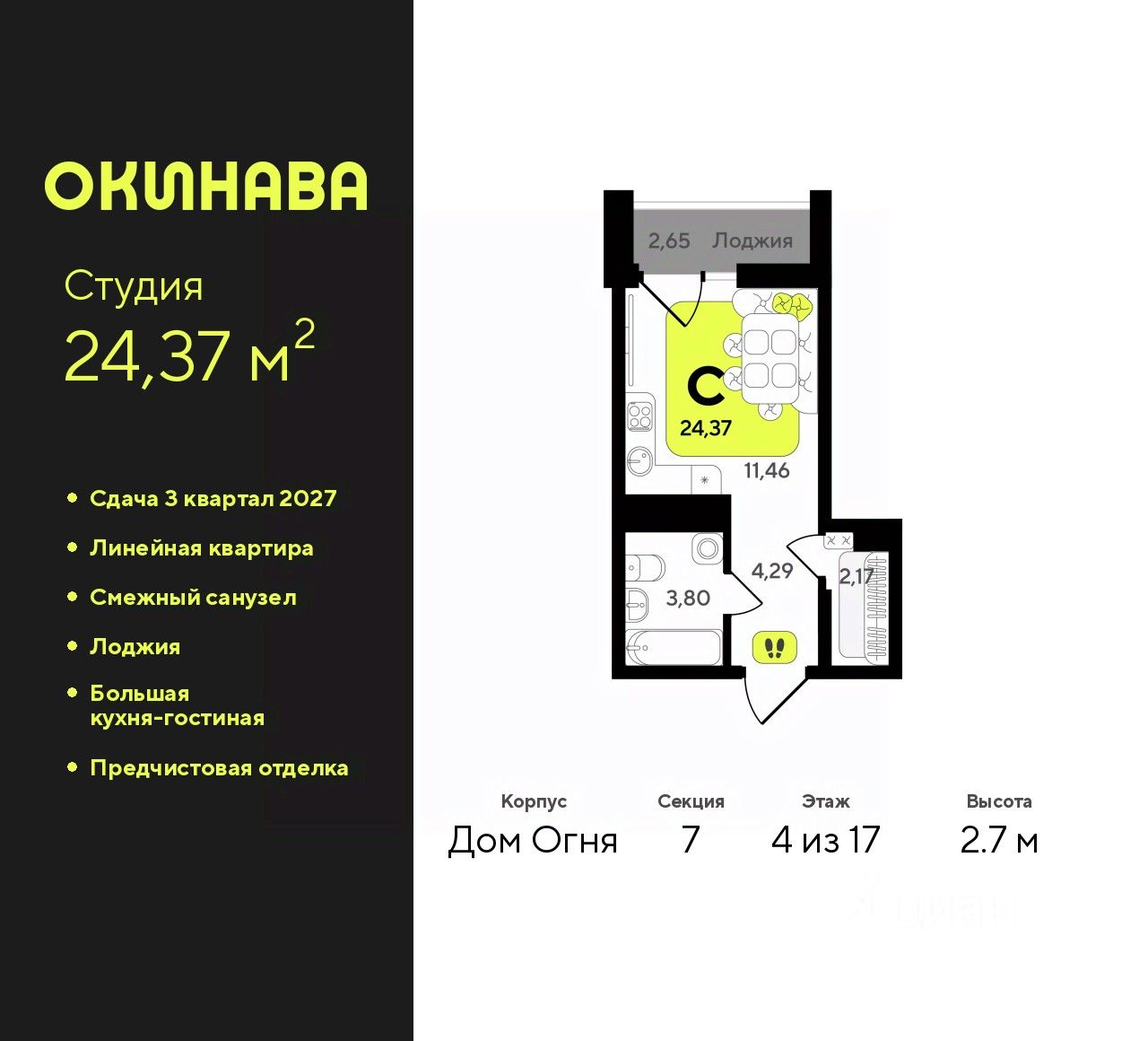 Продается 1-комн. квартира-студия с предчистовой отделкой в ЖК ''Окинава'' на 4 этаже. Общая площадь: 24.37 кв.м., площадь гостиной 11.46 кв.м., из которых 5 кв.м. выделено под кухонную зону. Все окна выходят на одну сторону. В квартире одна лоджия, один совмещенный санузел. Высота потолков 2.7 м.