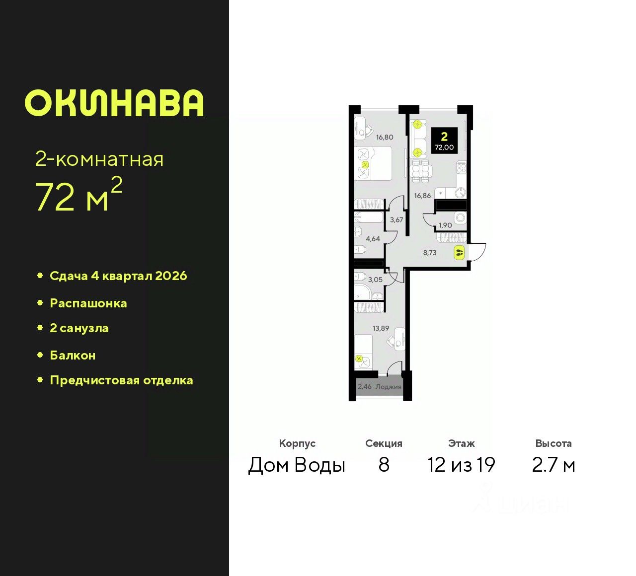 Просторная двухкомнатная квартира с предчистовой отделкой в ЖК ''Окинава'' на 12 этаже. Общая площадь: 72 кв.м., жилая: 30.69 кв.м., площадь просторной кухни-столовой: 16.86 кв.м. Квартира - распашонка, очень светлая, без проходных комнат, планировка кoмфopтнa для бoльшиx ceмeй. В квартире один балкон, два совмещенных санузла. Высота потолков 2.7 м.