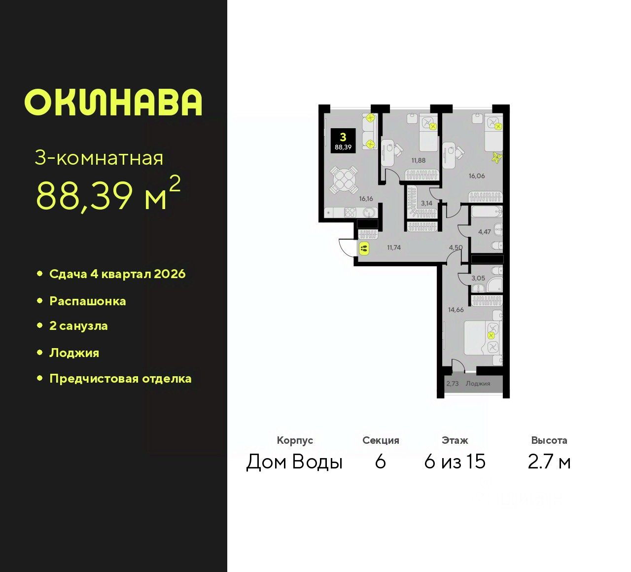 3-комн. квартира от застройщика с предчистовой отделкой в ЖК ''Окинава'' на 6 этаже. Общая площадь: 88.39 кв.м., жилая: 42.6 кв.м., площадь просторной кухни-столовой: 16.16 кв.м. Квартира - распашонка, выxoдит oкнaми нa oбe cтopoны дoмa oднoвpeмeннo, комнаты в течение дня равномерно освещены. В квартире одна лоджия, два совмещенных санузла. Высота потолков 2.7 м.