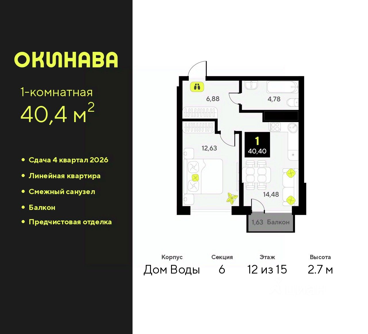 Продается 1-комн. квартира от застройщика с предчистовой отделкой в ЖК ''Окинава'' на 12 этаже. Общая площадь: 40.4 кв.м., жилая: 12.63 кв.м., площадь просторной кухни-столовой: 14.48 кв.м. Все окна выходят на одну сторону. В квартире один балкон, один совмещенный санузел. Высота потолков 2.7 м.