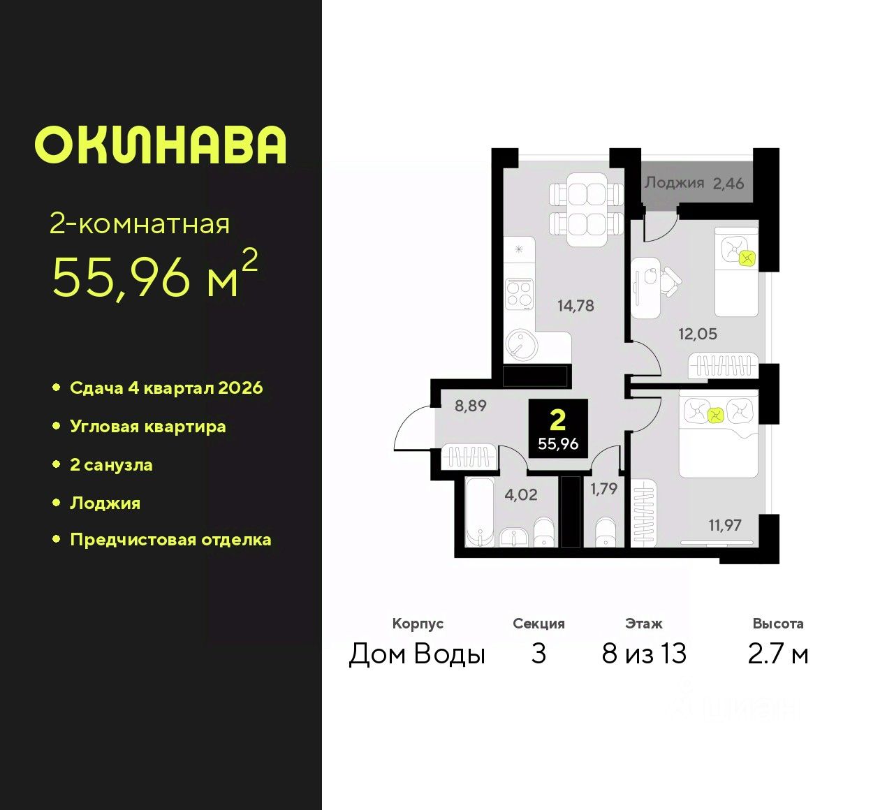 2-комн. квартира с предчистовой отделкой в ЖК ''Окинава'' на 8 этаже. Общая площадь: 55.96 кв.м., жилая: 24.02 кв.м., площадь просторной кухни-столовой: 14.78 кв.м. Квартира угловая, идеально подойдет любителям тишины и панорамных видов. В квартире одна лоджия, один совмещенный и один раздельный санузел. Высота потолков 2.7 м.