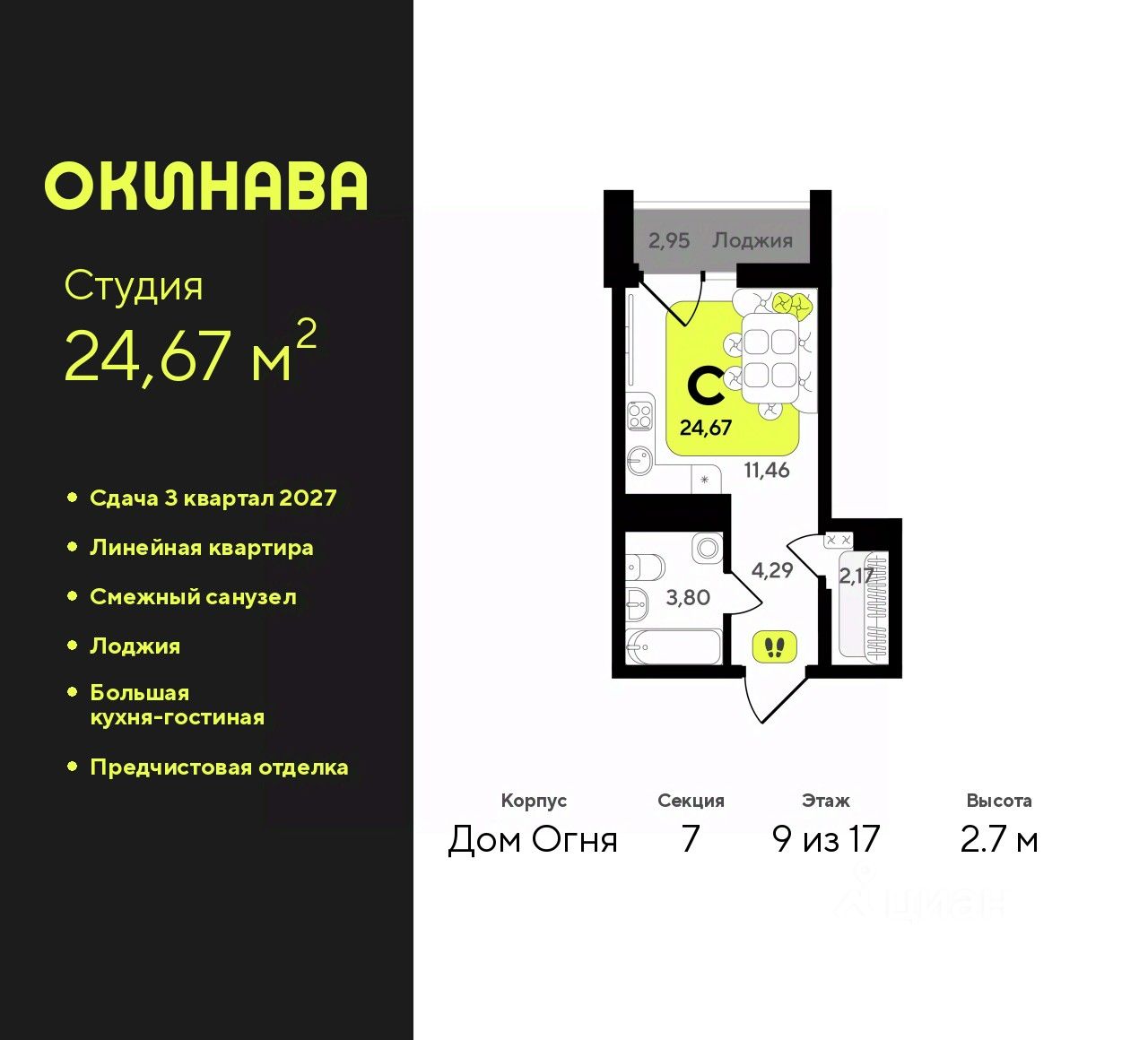 Однокомнатная квартира-студия с предчистовой отделкой в ЖК ''Окинава'' на 9 этаже. Общая площадь: 24.67 кв.м., площадь гостиной 11.46 кв.м., из которых 5 кв.м. выделено под кухонную зону. Все окна выходят на одну сторону. В квартире одна лоджия, один совмещенный санузел. Высота потолков 2.7 м.