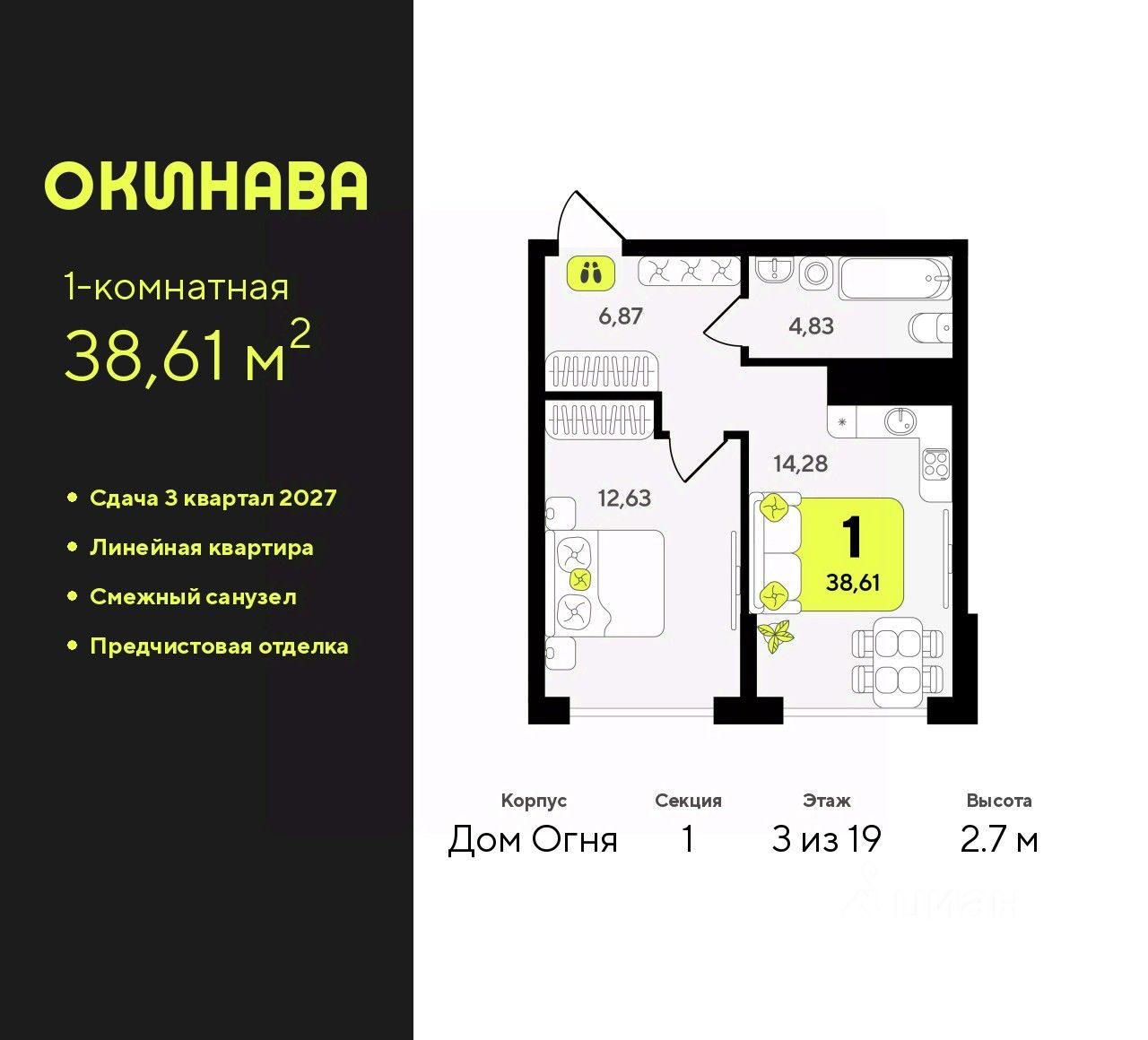 1-комн. квартира от застройщика с предчистовой отделкой в ЖК ''Окинава'' на 3 этаже. Общая площадь: 38.61 кв.м., жилая: 12.63 кв.м., площадь просторной кухни-столовой: 14.28 кв.м. Все окна выходят на одну сторону. В квартире один совмещенный санузел. Высота потолков 2.7 м.