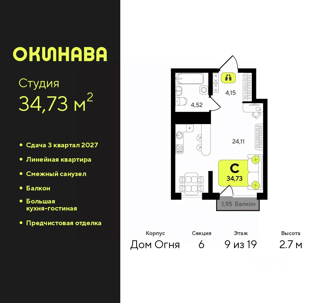 Продается 1-комн. квартира-студия с предчистовой отделкой в ЖК ''Окинава'' на 9 этаже. Общая площадь: 34.73 кв.м., площадь гостиной 24.11 кв.м., из которых 5 кв.м. выделено под кухонную зону. Все окна выходят на одну сторону. В квартире один балкон, один совмещенный санузел. Высота потолков 2.7 м.